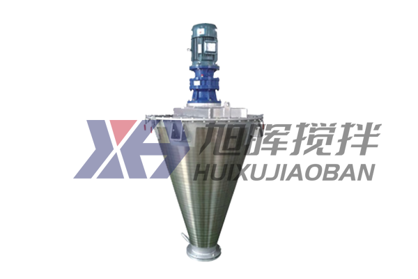 錐形螺帶混合機由傳動機構(gòu)、錐形筒、外層螺帶攪拌器、內(nèi)層反向螺桿攪拌器和出料閥組成。物料在外層螺帶攪拌器的作用下沿軸向盤旋、提升,內(nèi)層反向螺桿攪拌器將物料沿軸向盤旋下推,完成快速混合動作。根據(jù)實際需求,螺帶可選多種設(shè)計形式。